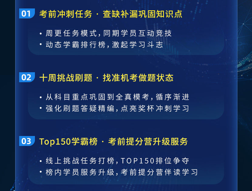 适合需要系统学习、打牢基础的学员。包含前导+基础+强化+冲刺4个学习阶段,经典题+百题2大专项训练,考前提供1套密卷和2套模考。