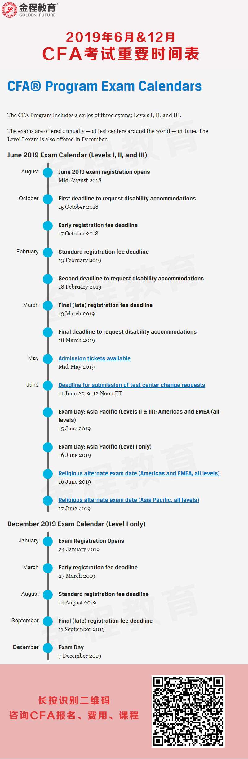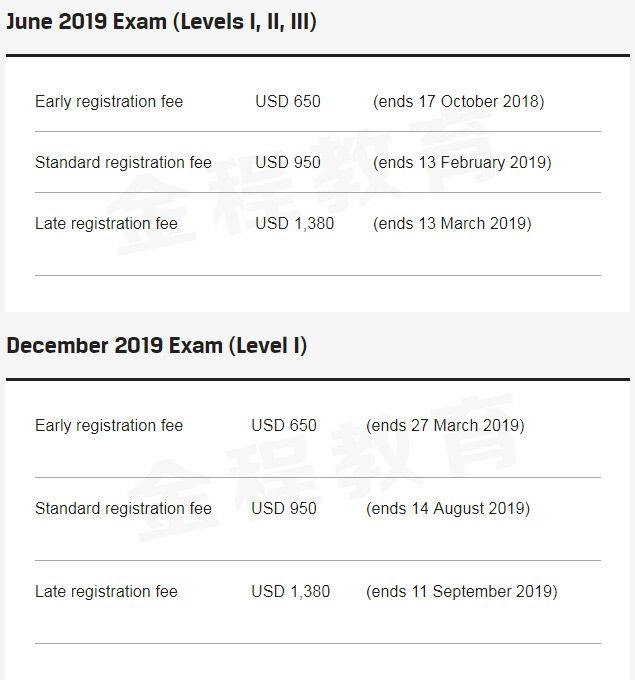 温馨提示:目前是6月份考试报名的第二阶段截至日期是2019年2月13日,2019年12月CFA一级考试第一阶段报名也正式开始了,另外亚太考生需注意,CFA一级将在6月16日举行,CFA二三级将在6月15日开考,官网关于2019年CFA考试时间费用说明如下:》》》对于CFA考试时间和费用有不清楚的点我咨询