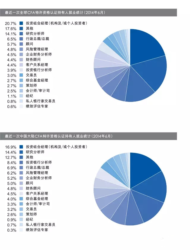 全球范围内,雇佣CFA协会会员的十大主要公司:美国银行美林证券(Bank of America Merrill Lynch)、花旗集团(Citigroup)、瑞士信贷集团(Credit Suisse)、德意志银行(Deutsche Bank)、汇丰银行(HSBC)、摩根大通(JP Morgan Chase)、摩根斯坦利(Morgan Stanley Smith Barney)、加拿大皇家银行(RBC)、瑞士联合银行(UBS)、富国银行(Wells Fargo)--打造"金领人生"