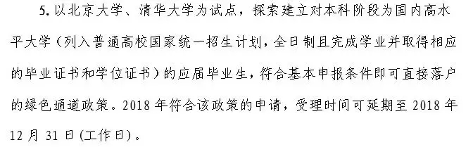 2018年非上海生源应届普通高校毕业生进沪就业申请本市户籍的标准分仍为72分,但今年的政策增加了这样一条规定:以北京大学、清华大学为试点,探索建立对本科阶段为国内高水平大学(列入普通高校国家统一招生计划,全日制且完成学业并取得相应的毕业证书和学位证书)的应届毕业生,符合基本申报条件即可直接落户的绿色通道政策。