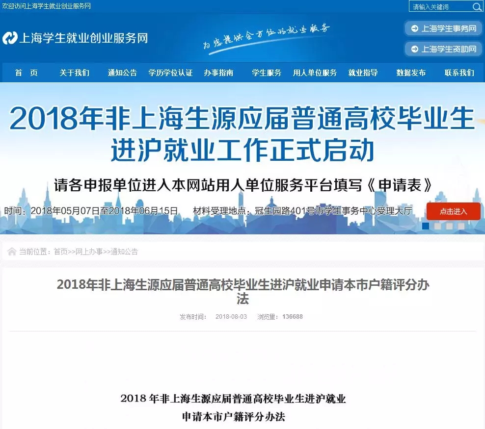 8月3日,上海学生就业创业服务网公布了《2018年非上海生源应届普通高校毕业生进沪就业申请本市户籍评分办法》。