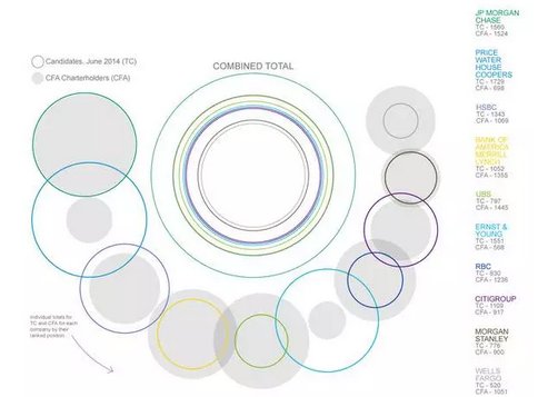 JP Morgan Chase(摩根大通)、PwC(普华永道)、HSBC(汇丰银行)、Bank of America Merrill Lynch(美银美林)、UBS(瑞银)、E&Y(安永)、RBC(加拿大皇家银行)、Citigroup(花旗集团)、Morgan Stanley(摩根士丹利)、Wells Fargo(富国银行),每家各有几百到一千余名 CFA 持证人供职。