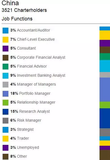 截至2018年1月1日,中国共有5058名CFA 持证人,职业分布如下: