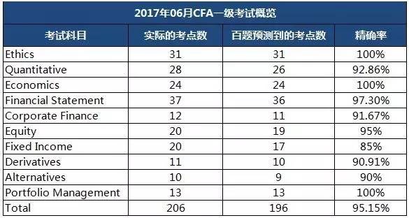 纵观刚刚过去的CFA一级考试,考试题目还是侧重于对于基本重要知识点的考查,其中部分题型较为灵活,考查了考生对于知识点的灵活运用。在金程推出的《金程教育2017年12月CFA一级百题预测》中95.15%以上的考点均有覆盖。