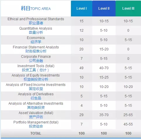 CFA一级科目权重是固定的,CFA二级和三级都是浮动比重,三级有几门都总结归为Portfolio(实际为Asset Allocation,个人IPS,机构IPS,Behavioral Finance,Execution,Performance Evaluation),大家可以在学习的过程中慢慢细化投入的时间。