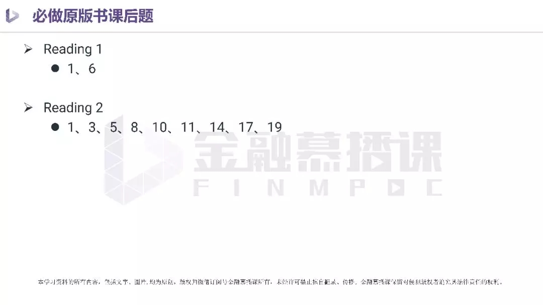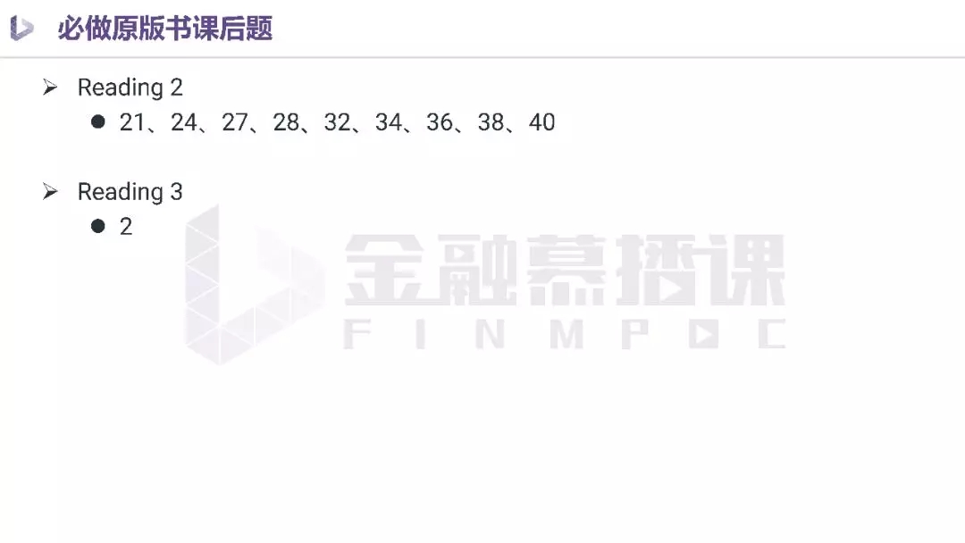 金融慕播课精选必做原版书课后题,提高同学们做题的效率,只做好题,重点题,合理分配有限的考前时间。