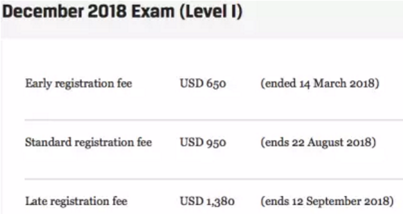 温馨提示: 如果有计划参加2018年12月1日的CFA Level I,第二阶段的报名截止时间是美国东部时间8月22日,错过这个时间价格将上涨430美金哦 。
