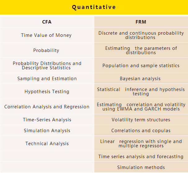 首先从最显而易见的数量(quantitative)开始。下表罗列了CFA与FRM的考点,如果不区分知识点的先后顺序,我们可以看到两者有很多相同的关键词: probability distributions, statistics, sample, hypothesis testing, correlation, regression, time series analysis, simulation。