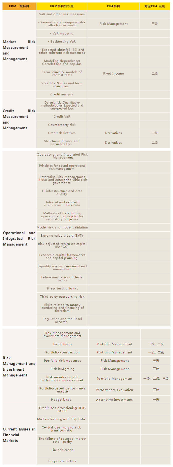 接下来分析的知识点不那么直观,且分散在各个学科中,由于FRM的学科数比CFA少,且学习体系不及CFA完善(不争的事实),所以我们将FRM每门科目展开,去对应CFA知识主体的考点。