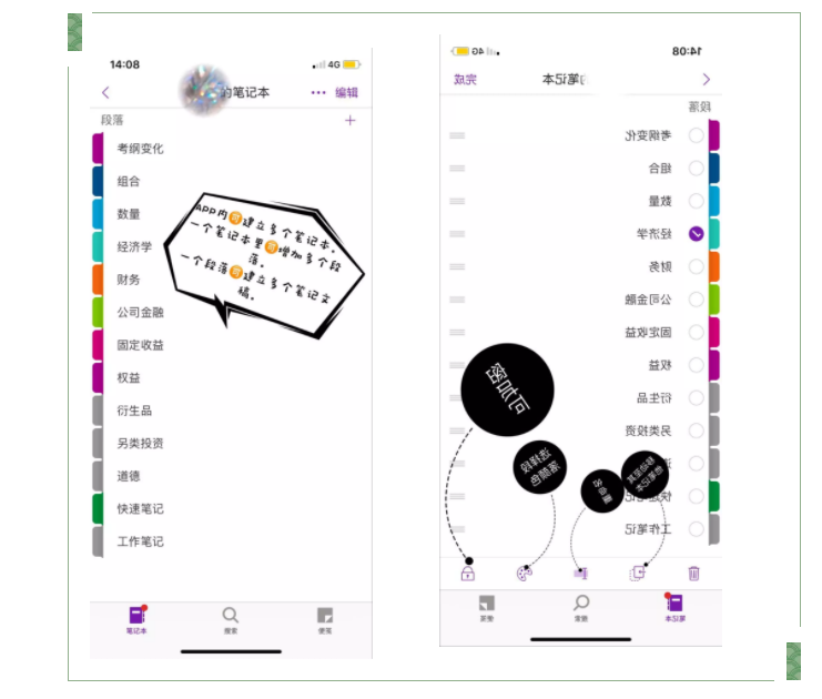 长按某一段落(如“经济学”)就能调出编辑按钮。可以对不同段落设定不同的颜色来区分哦,这样整个笔记本都会很好看哦(哈哈哈~o(∩_∩)o )。还可以对重要的内容进行加密哦,为你提供保密性~是不是超实用!